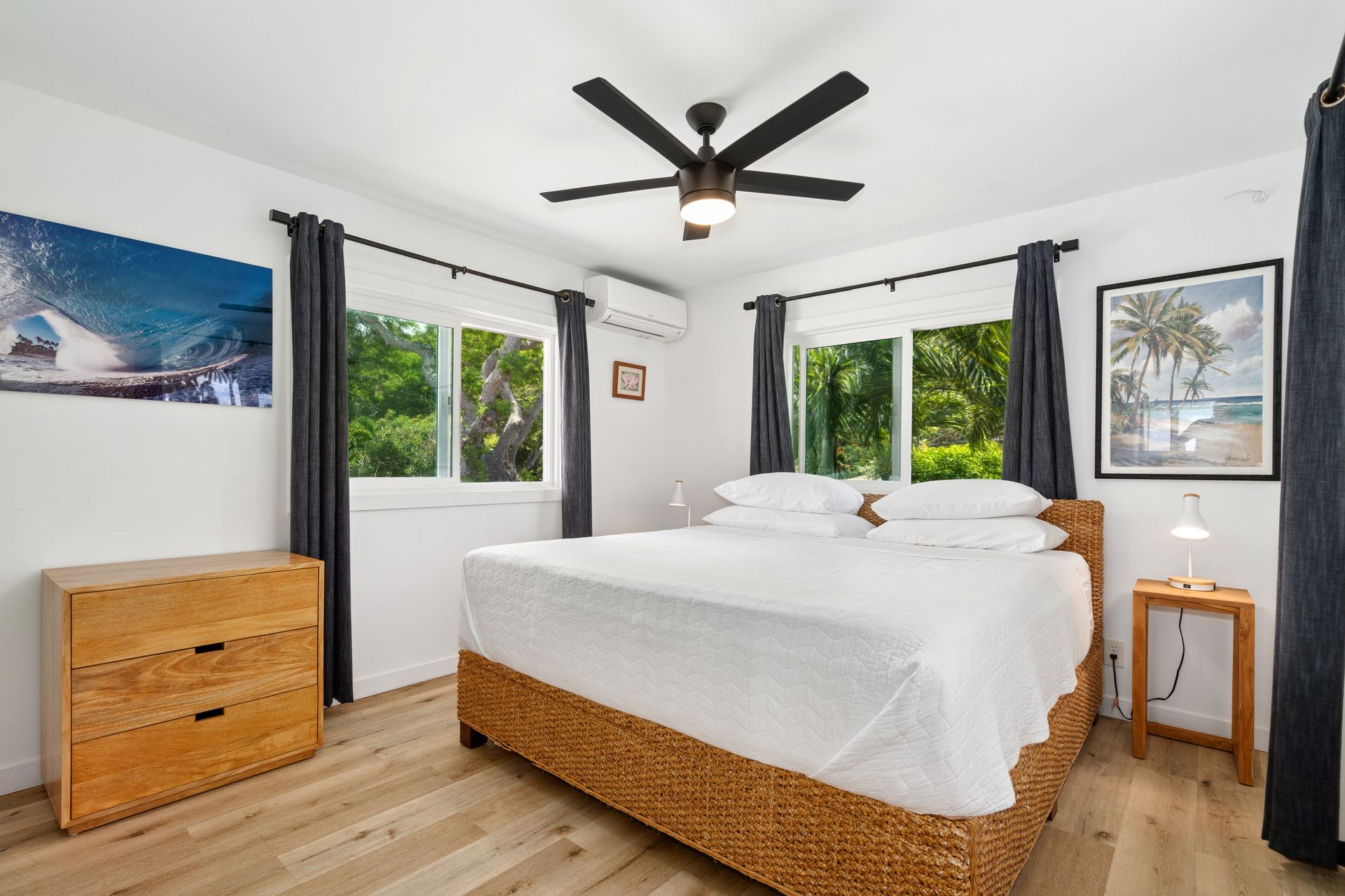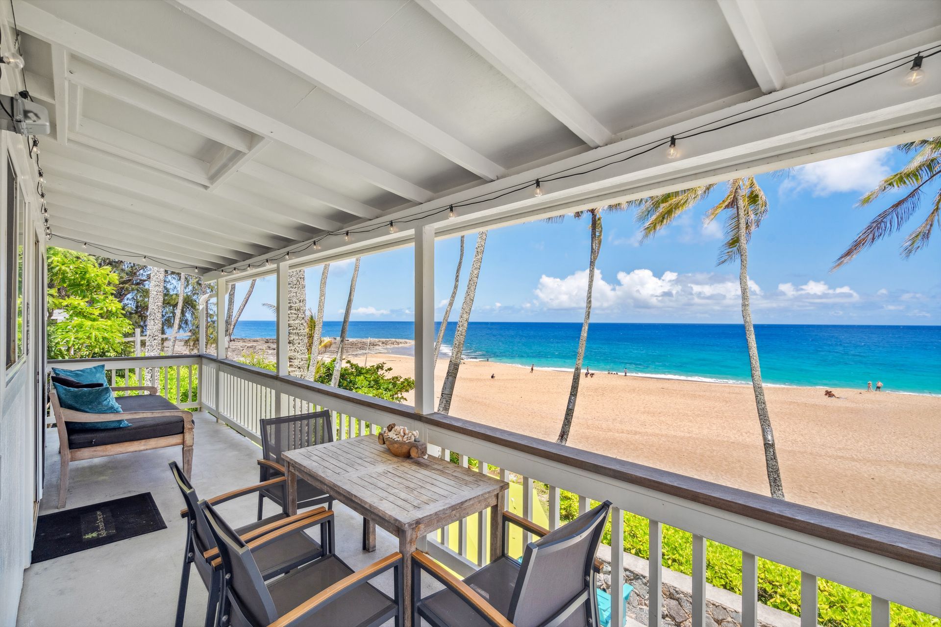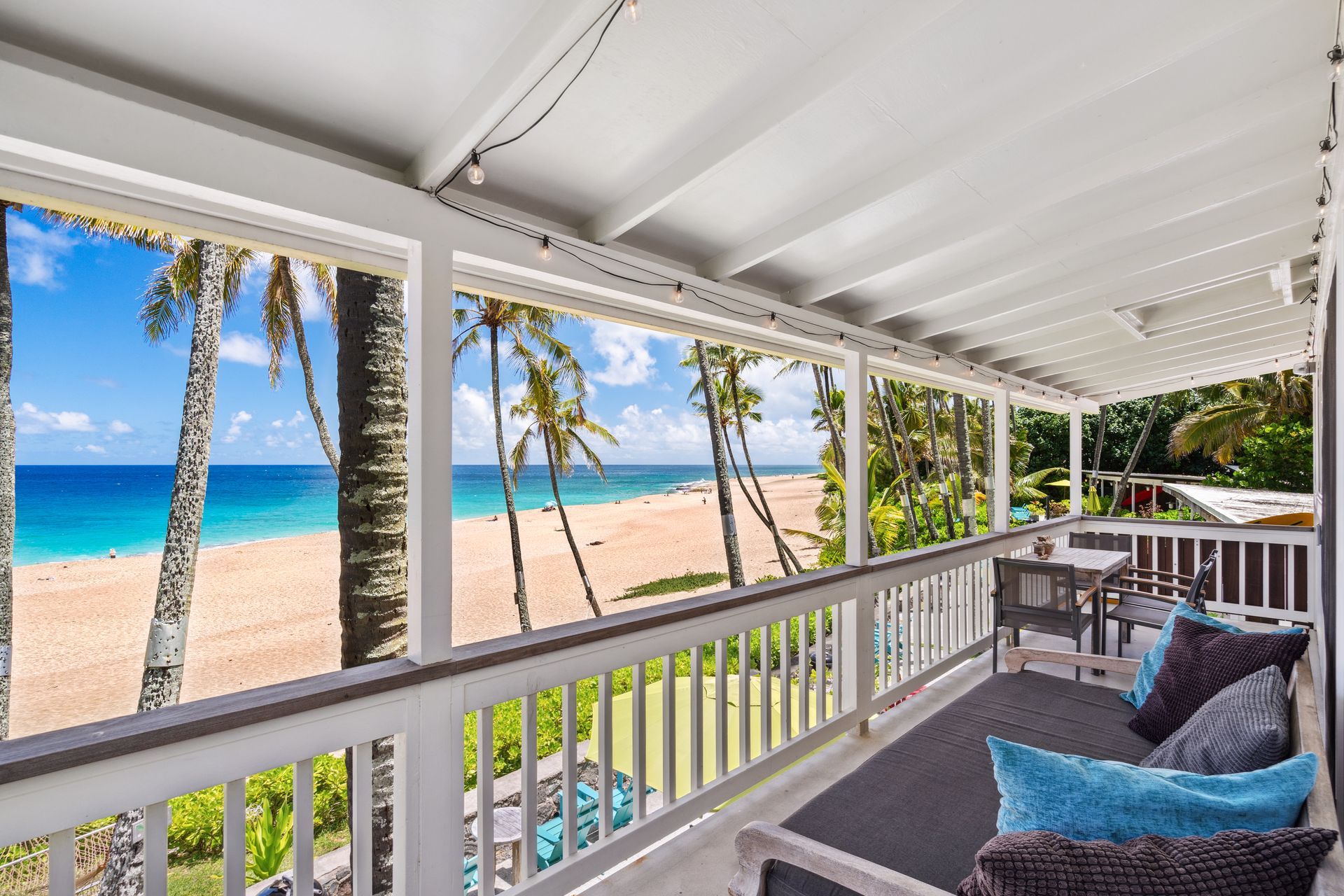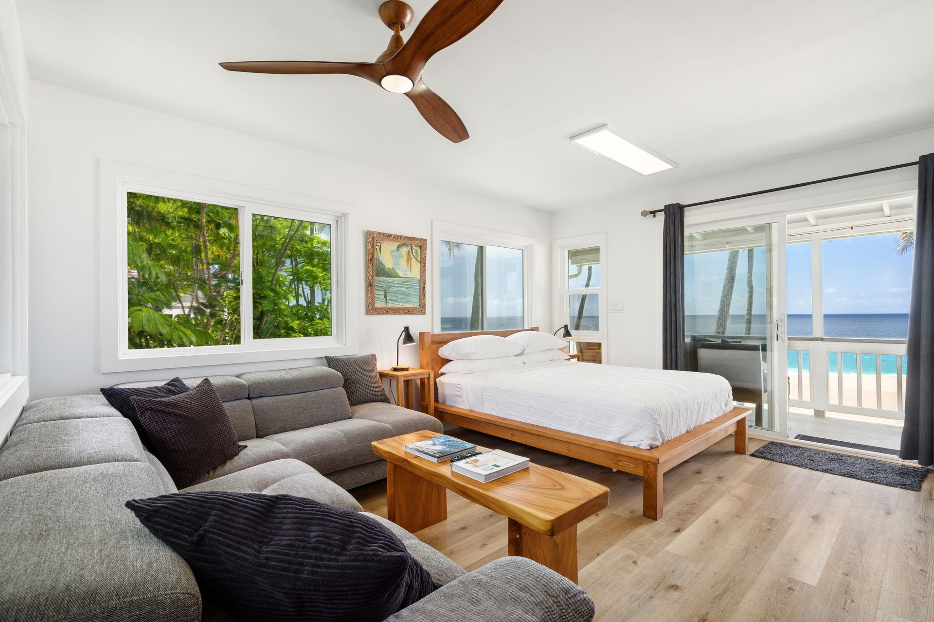 Second‑story beachfront; king bed in bedroom; queen bed and sectional sofa in living; covered deck with Bali day sofa plus downstairs open deck with BBQ; honeymoon‑style unit with maximum ocean views.